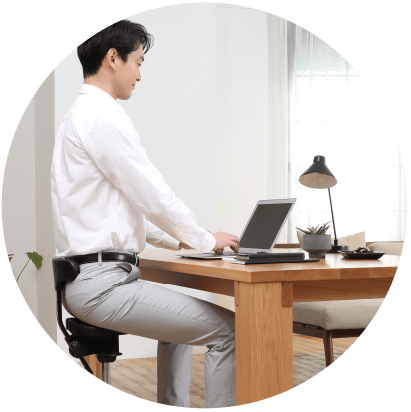 特許取得の特殊な座面をまたいで座ると、自然と「坐骨」で座る姿勢に。骨盤が立ち、腰への負担を大幅に軽減します。長時間座って作業することが多いクリエイターの身体を快適にサポートします。